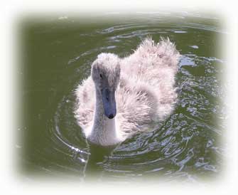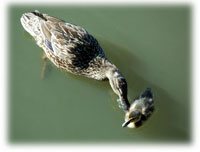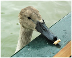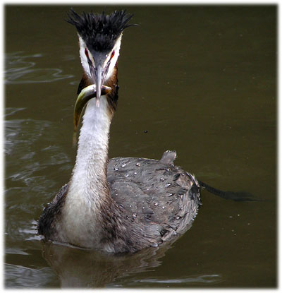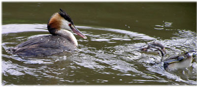 Skäggdopping, vanligen en mycket skygg fågel. Men denne hade lärt sig att när båtfolket fodrade änder ramlade det alltid lite brödsmular i vattnet. Och där det finns brödsmular finns det fisk - till ungen!