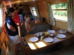 Canal boat framför brasan och drömmer om kommande sommarturer